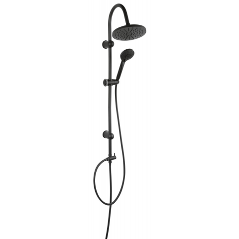 RONDO zuhanyszett - 3 funkciós, fej és kézizuhannyal, fekete fém zuhanyrúd 106 mm állítható távolságú falitartók (falon már meglévő lyukba illeszthető) fejzuhany átmérője: 20 cm kézizuhany: 3 funkciós, átmérője: 10 cm FerroEasyClean könnyű vízkőeltávo