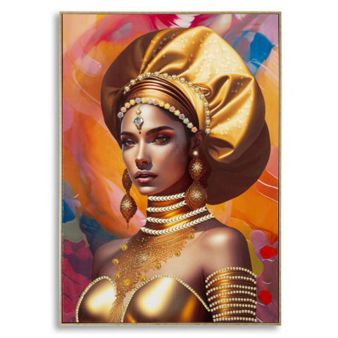 Samira portré - Falikép vászonra festve, arany kerettel ✨ Ez a lenyűgöző falikép egy gyönyörű nőt ábrázol hagyományos viseletben és turbánban. A részletgazdag festmény egyedi hangulatot kölcsönöz otthonának. A képet kézzel festették, és egy elegáns,...