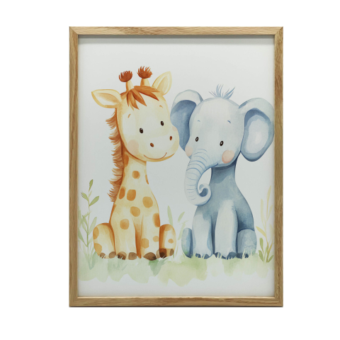 Dzsungelbarátok vászonkép: Vidám zsiráf és elefánt a gyerekszobába 🦒🐘 Ez a bájos vászonkép egy vidám zsiráfot és egy aranyos elefántot ábrázol, akik együtt játszanak a dzsungelben. A képet Marcin Zbijowski lengyel művész tervezte, és prémium minősé...
