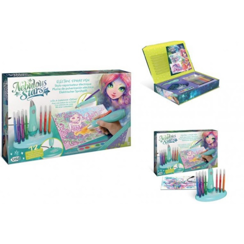 Elektromos permetező toll, töltő állomás, USB kábel, 12 speciális jelző, 10 kép festék szórására, 2 sablonlap, maszkoló matrica lap, 6 akvarell festék, ecset, Coralia teljes története, tároló Fessen úgy, mint egy profi! Válassza ki a kívánt színt, helyez