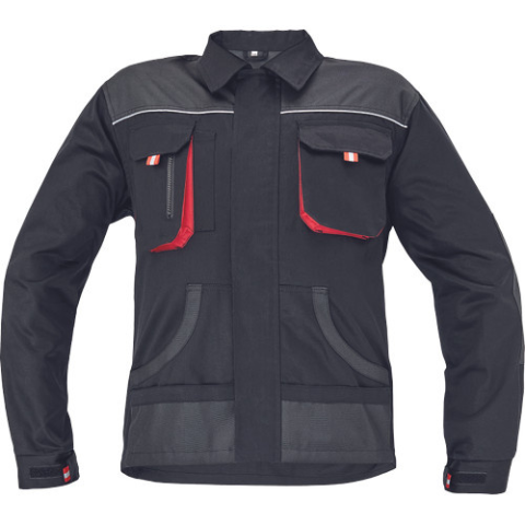 FF HANS kabát fekete/antracit 46 • férfi munkakabát • cipzáras kivitelben, tépőzáras hajtókával • 2 tépőzáras mellzseb • 2 multifunkcionális oldalzseb • OXFORD poliészter erősítés könyökrészeken és a vállakon • 100% pamut, 235g/m2