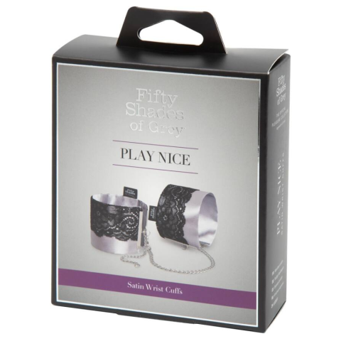 A Szürke ötven árnyalata sorozat újabb tagja kíván csatlakozni a gyűjteményedhez!Érzéki, ezüst színű szatén bilincs pár, finom, fekete csipke díszítésekkel.