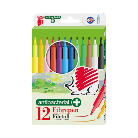 Filctoll ICO Süni 300 antibakteriális 12 darabos Antibakteriális rostirón vízbázisú festékkel töltve, átlevegőzős biztonsági kupakkal, rajzolásra, színezésre. A műanyag alkatrészek antibakteriális védelmet adó Biomaster ezüst-ionokat tartalmaznak (bioc
