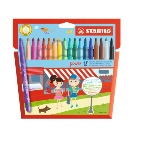 Filctoll STABILO Power 18 darabos Gazdag színválaszték Könnyen kimosható Légzőszeleppel ellátott kupak Vastag, L-es heggyel, vonalvastagság 2 mm