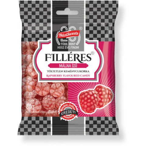 Málna ízű töltetlen keménycukor 20 db/karton Összetevők: cukor, glükóz szirup, étkezési sav: citrom sav, málna aroma, színezék: Kárminvörös. Átlagos tápérték 100g-ban Energia 1491kJ/351kcal Zsír 0,1g amelyből telített zsírsavak 0,03g Szénh
