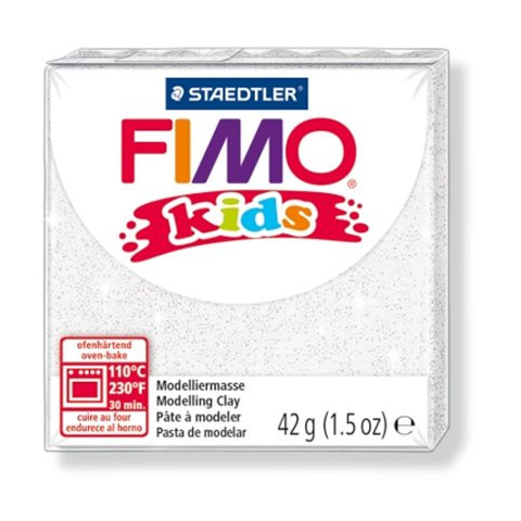Gyurma, 42 g, égethető, FIMO Kids, glitteres fehér - kiégethető gyurma, 42g - puhítsa, amíg felveszi a kívánt formát - nem játék, nem ehető - bútorral, kárpittal stb. ne érintkezzen - max. 30 perc égetési idő 110°C-on, alufóliára, sütőpapírra helyezve