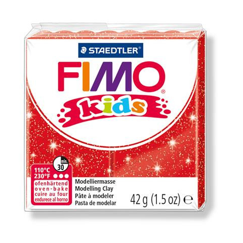 Gyurma, 42 g, égethető, FIMO Kids, glitteres piros - kiégethető gyurma, 42 g - puhítsa, amíg felveszi a kívánt formát - nem játék, nem ehető - bútorral, kárpittal stb. ne érintkezzen - max.30 perc égetési idő 110°C-on, alufóliára, sütőpapírra helyezve
