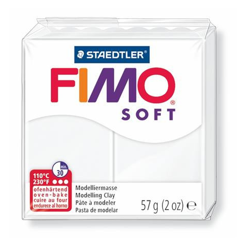 Gyurma, 57 g, égethető, FIMO Soft, fehér - kiégethető gyurma, 56 gramm - speciális alkalmazáshoz, technikákhoz - könnyen keverhető, FIMO Soft és Classic gyurmákkal is - puhítsa, amíg felveszi a kívánt formát - 8 éven felülieknek ajánlott, nem ehető