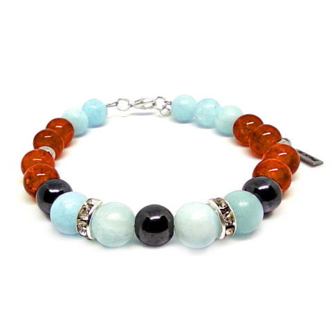 Figyelem! Nem szakad, nem nyúlik! Tartós ékszer. Az ékszer ásványai és tartozékai: – 8 mm-es matt türkiz Jade ásványok – 8 mm-es piros roppantott hegyikristály ásványok – 8 mm-es fekete hematit ásványok – Ezüst színű strasszos d