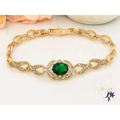 Gold filled központi zöld köves karkötő körbe tűcirkónia foglalatba Szin: 18K Méret: 17-19 cm kivehető szem Kő:8x10 mm