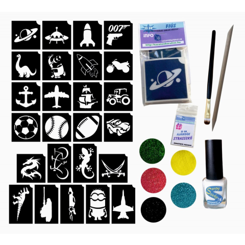 1 kép FIÚS közepes csillámtetoválás készlet (32 db-os - 25 sablon / 5 csillámpor)
