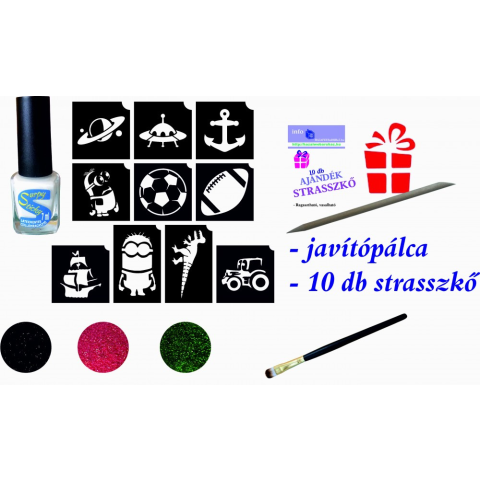 Tartalma: - 10 db különböző fiús sablon - 3 db különböző csillámpor (készletfüggő) - 1 db Extra csillámragasztó - 7 ml - 7-14 napos - 1 db ecset Fontos figyelmeztetés!!! A csillámtetoválás nem alkalmazható a szem vagy száj környékén. Az alapany