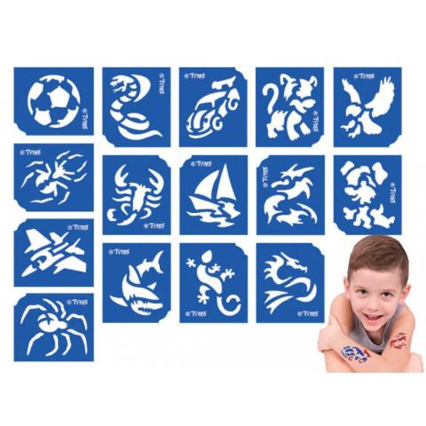 A csomagban található sablonok segítségével fiús csillámtetoválás mintákat készíthetsz, melyeket egyéb testfestéshez is felhasználhatsz. Ebben a csomagban olyan sablonokat találsz, amit nagyon szeretnek a fiúk. Olyan slágermintákat kapsz, mint a pók, jár