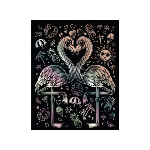 Távolítsd el a fekete réteget, és egy flamingós képet fogsz kapni! A Flamingó hologramos képkarcoló egy A4-es méretű fekete lapot tartalmaz, amiről a speciális szerszámmal tudod lekaparni a fekete felületet. Ha jól csináltad, egy színes, ezüstösen csillogó flamingó képét fogod kapni, amit akár a falra is ki tudsz akasztani. A Flamingó hologramos képkarcoló fejleszti a művészi érzéket, és a kézügyességet is, a készlet a kaparót is tartalmazza.