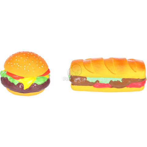 Flamingo sípolós latex gumijáték - hamburger, hotdog 1 db