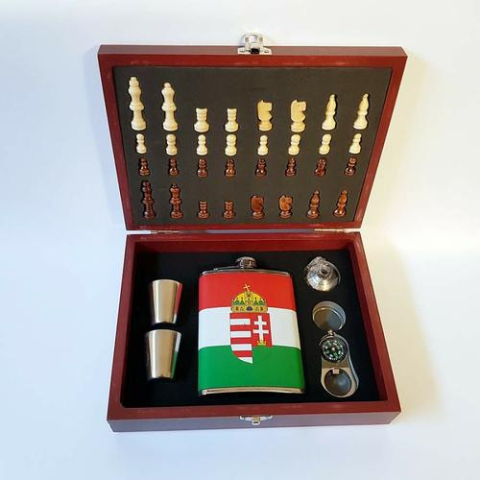 Flaska szett magyar címerrel, sakk készlettel, iránytűvel ajándéktárgy árgrafikon