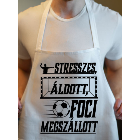 Foci megszállott kötény, ajándék focistáknak. Stresszes, áldott foci megszállott vicces feliratos kötény a futball szerelmeseinek, azoknak, akik foci nélkül nem tudnak élni. Ajándékozz egy ilyen kötényt párodnak, családtagodnak vagy egy ismerősödnek, mely