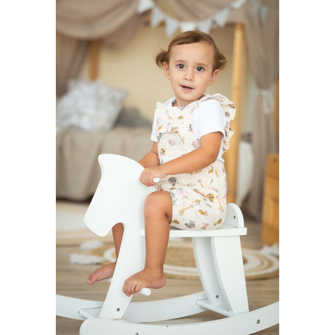 Ez a bájos lányos kertésznadrág tökéletes választás a kis divatkedvelők számára. A nadrág 100% muszlin anyagból készült, amely rendkívül puha és légáteresztő, biztosítva a baba kényelmét a legmelegebb időben is. Különlegessége