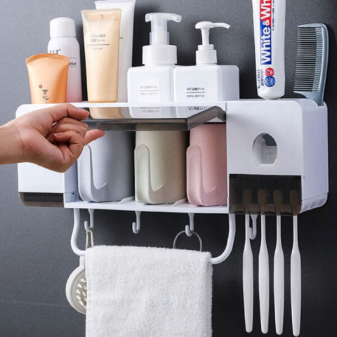 Fogkefe rendszerező - fogkrém adagoló 24193A fogkefe és a csésze- adagoló rendszerező tökéletes minden fürdőszobába. A szervezőben rekeszek vannak a kiegészítők számára, mint például krémek, sminkecsetek, dezodorok stb.A csészék alatt lyukak találhatók a mellékelt horgok és fogkefék rögzítéséhez.Az univerzális szervezőnek van egy fiókja is, amiben füldugót tárolhatunk, vagy telefonállványként is használható.A készülék 3 db 300 ml-es műanyag pohárra