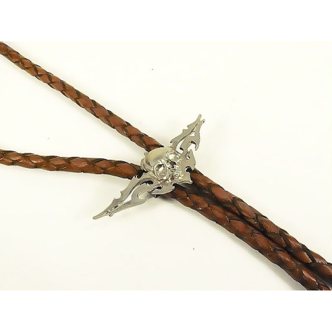 Koponya amerikai nyakkendő. Fekete vagy barna valódi fonott bőr, fekete antik galvanizál fém koponya nonfiguratív mintán és fém záró dísszel Anyaga: zamak