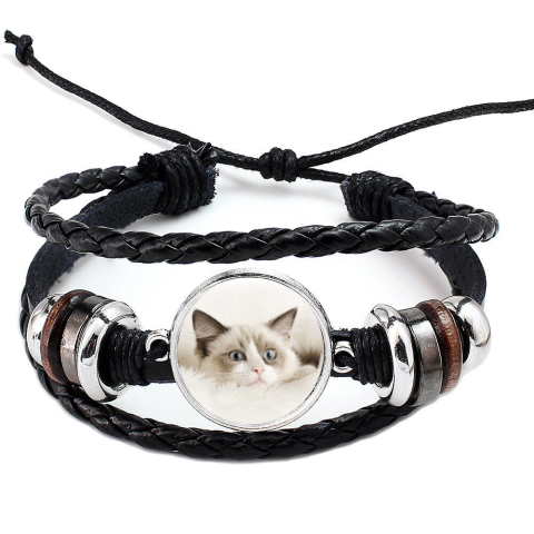 1 kép Fonott, dizájnbőr uniszex állítható fehér cicás (2.) karkötő, feliratozható