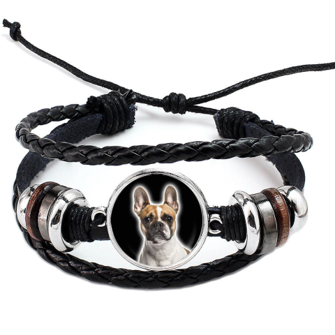 1 kép Fonott, dizájnbőr uniszex állítható francia bulldogos karkötő, feliratozható