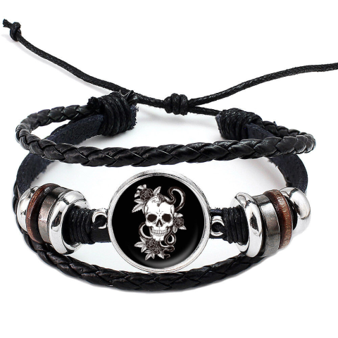 1 kép Fonott, dizájnbőr uniszex állítható koponya rózsával karkötő