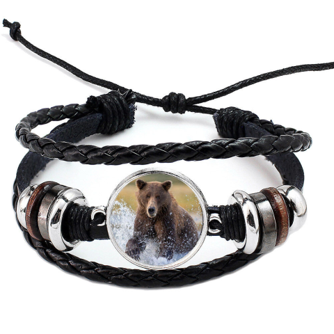 1 kép Fonott, dizájnbőr uniszex állítható Medvés karkötő, feliratozható