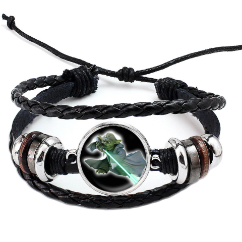 1 kép Fonott, dizájnbőr uniszex állítható Yoda fénykarddal karkötő, feliratozható