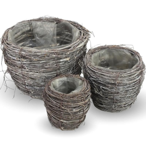 Természetes hatású, fonott indából készült kaspó szett három különböző méretben. A fóliabélésnek köszönhetően élő növényekhez, virágkötészeti kompozíciókhoz és dekorációkhoz is ideális. Rusztikus stílusú darab, amely bá