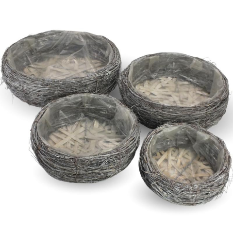 Természetes megjelenésű, fonott indából készült tál szett négy különböző méretben. A fóliabélés megvédi az anyagot a nedvességtől, így virágkötészeti kompozíciók, ajándéktálak vagy dekorációk készítéséhez is kiválóan