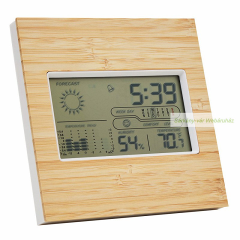 FORECAST időjárás állomás: bambusz előlappal, ébresztő funkcióval, dátum- és időkijelzéssel, páratartalom- és hőmérő (°C-ban és °F-ban), kihajtható állvánnyal és lyukkal a hátoldalon a falra rögzítéshez Szín: barna Méret: 13 x 13 x 2,3 cm Nettó súly (kg):