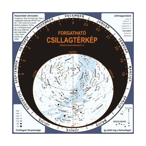 Csillagtérkép kezdőknek merev kartonból Forgatható csillagtérképünket azoknak ajánljuk, akik a lehető legegyszerűbben szeretnék megismerni az éjszakai égbolt legfontosabb csillagképeit. Kitűnően kiegészíti a Csillagatlasz kistávcsövek c. kiadványt. A térkép használata roppant egyszerű: állítsa be az aktuális dátumot és időt, és a kivágás megmutatja, mely csillagképek figyelhetőek meg a fejünk felett. A csillagképek magyar megnevezéseit tüntettük fel kb.
