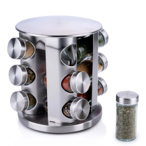 Forgó Fűszertartó Állvány 12 Üveggel – Praktikus és Modern Ezüst Dizájn Minden Konyhába Ez a praktikus fűszertartó állvány kevés helyet foglal, és azonnali hozzáférést biztosít minden étel ízesítőjéhez. Minden amatőr séf konyhájában kötelező darab. A for
