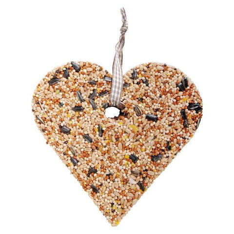 Szív formába tömörített madáreleség. A hűvösebb, téli időszakban a madarak is hálásabbak egy kis madáreleségért, amit kikészítenek nekik. Jelenlétükkel pedig a mi kertünk is otthonosabbá válik. Összetevők: búza, köles, aprított