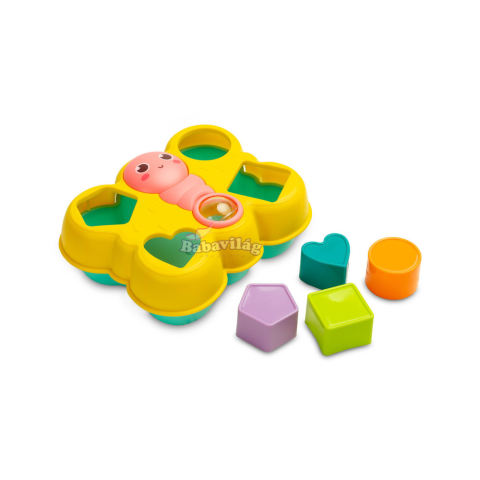 Nagyszerű logikai játék a legkisebbek számára. 4 színes formát tartalmaz, amelyek illeszkednek a fedél lyukaihoz. A pillangó mosolygós arca elfordítható, a farkán pedig egy átlátszó gömb található, színes, zörgő golyókkal. A játék 18 hónaposnál idősebb g