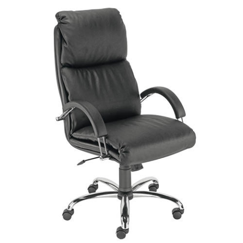 Fekete textilbőr kárpitozású irodai fotel. Front oldalán fekete színű textilbőr kárpitozású ülőrész. Magas háttámla nyaktámasszal. Krómozott fémvázas fix karfa, felső részén fekete bőr kárpitozású karfapad rátét. Hintamechanika 1 rögzítési pozícióval. Az