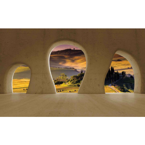 Fotótapéta - Toszkán táj - 368x254 cm - 4 részes Gyönyörű toszkán tájképet varázsolhat otthonába ezzel a 4 részből álló fotótapetával! A tapéta lenyűgöző panorámát nyújt a napsütötte dombokkal, ciprusfákkal és aranyló mezőkkel. Különleges, modern di...