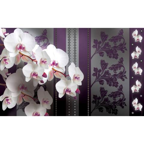 Elegáns orchidea fotótapéta - 368 x 254 cm, 4 részes Díszítse otthonát ezzel a lenyűgöző, nagy méretű fotótapétával! A tapéta négy darabból áll, így könnyen felhelyezhető nagyobb felületekre is. A gyönyörű fehér orchideák és az elegáns lila-szürke mi...