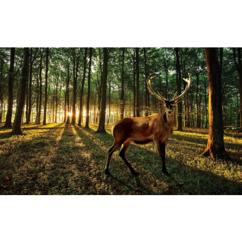 Látványos erdei szarvas fotótapéta - XL méretű, naplementés hangulat Ámulatba ejtő fotótapéta, mely egy impozáns szarvast ábrázol egy varázslatos erdőben, naplemente fényében. Ez a 4 részből álló falikép tökéletes választás, ha szeretnéd otthonodba v...