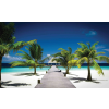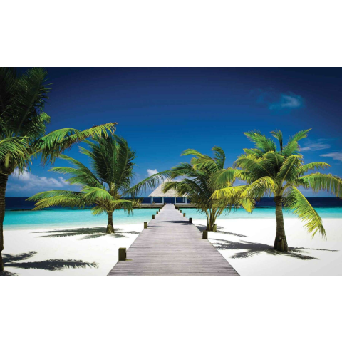 Fotótapéta - Tengerparti Üdülő XL: Vigye el otthonába a trópusok hangulatát! 🌴 Élvezze a nyugalmat és a napsütést minden nap ezzel a lenyűgöző fotótapetával! A 4 részből álló tapéta egy gyönyörű tengerparti üdülőt ábrázol, pálmafák, fehér homokos pa...