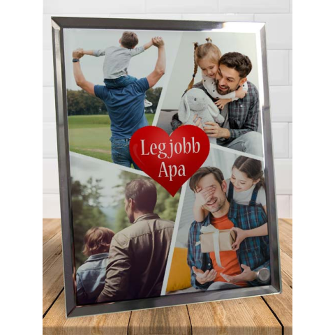 Fotóüveg kollázs fotókkal, legjobb apa. Kollázs fényképes fotóüveg a legjobb Édesapáknak. Különleges ajándék Apukád születésnapjára, névnapjára vagy apák napjára. Egy meglepetés amiről bármikor eszébe jutsz, ha ránéz. Üvegkép, melyen egy 4 fotóból álló ko