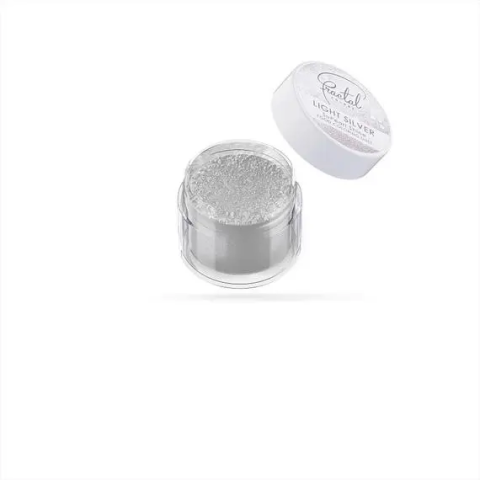 Ételdekorációsselyempor, világos metál ezüst színben. Töltőtömeg 3 g E171 tartalmaz Térfogat 10 ml