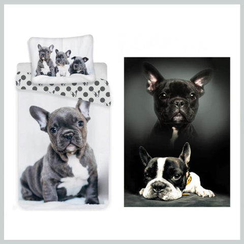 Francia bulldog ágyneműhuzat és polár takaró JVL0141Kutyás ágyneműhuzat és polár takaró szettÁgynemű anyaga:100% pamut.Mérete: 140×200cm, 70×90 cmKitűnő színtartó anyagból készül.Minősége: I osztályú.Takaró anyaga: 100% Polar Fleece.Mérete: 100x140 cm
