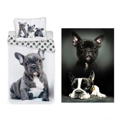 Francia bulldog ágyneműhuzat és polár takaró JVL0141 Francia bulldog ágyneműhuzat és polár takaró JVL0141 Kutyás ágyneműhuzat és polár takaró szett Ágynemű anyaga:100% pamut. Mérete: 140×200cm, 70×90 cm Kitűnő színtartó anyagból készül. Minősége: I