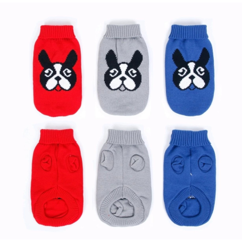 Francia bulldog fej mintás kötött kutyapulcsi, szürke, M-es kutyaruha 1 kép