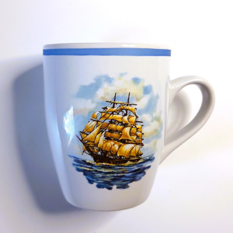 Fregatt hajós bögreA bögre a mintával átellenes oldalon név felirattal személyessé tehető. Mosogatógépben tisztítható, mikrohullámú sütőbe betehető.