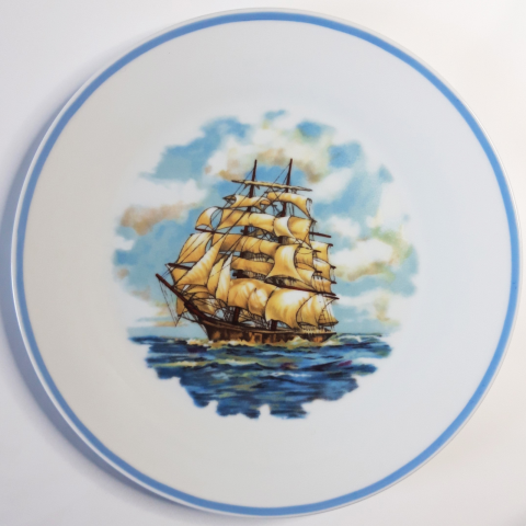 Fregatt kistányérKlasszikus vitorlás fregattal díszített porcelán tányér. mely felirattal névre szólóvá is tehető.A porcelánt festés után 820 fokon égetem ki, mikrohullámú sütőbe betehetők, mosogatógépben tisztíthatók.