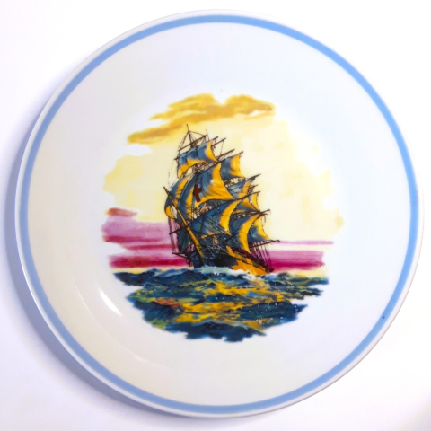 Fregatt kistányérKlasszikus vitorlás fregattal díszített porcelán tányér. mely felirattal névre szólóvá is tehető.A porcelánt festés után 820 fokon égetem ki, mikrohullámú sütőbe betehetők, mosogatógépben tisztíthatók.