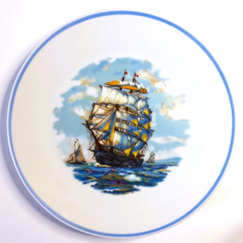 Fregatt kistányérKlasszikus vitorlás fregattal díszített porcelán tányér. mely felirattal névre szólóvá is tehető.A porcelánt festés után 820 fokon égetem ki, mikrohullámú sütőbe betehetők, mosogatógépben tisztíthatók.